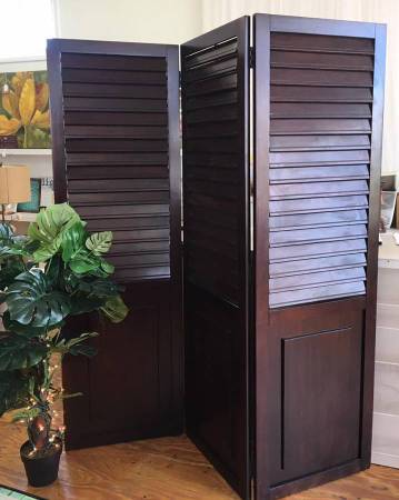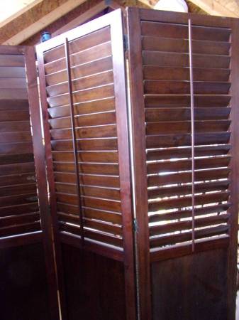 Pier One Imports solid wood room divider. Beautiful dark brown wood. Plantation shutters on top open and close. Each panel measures 22 inches wide x 6 foot tall. In very nice condition and from a non-smoking environment.